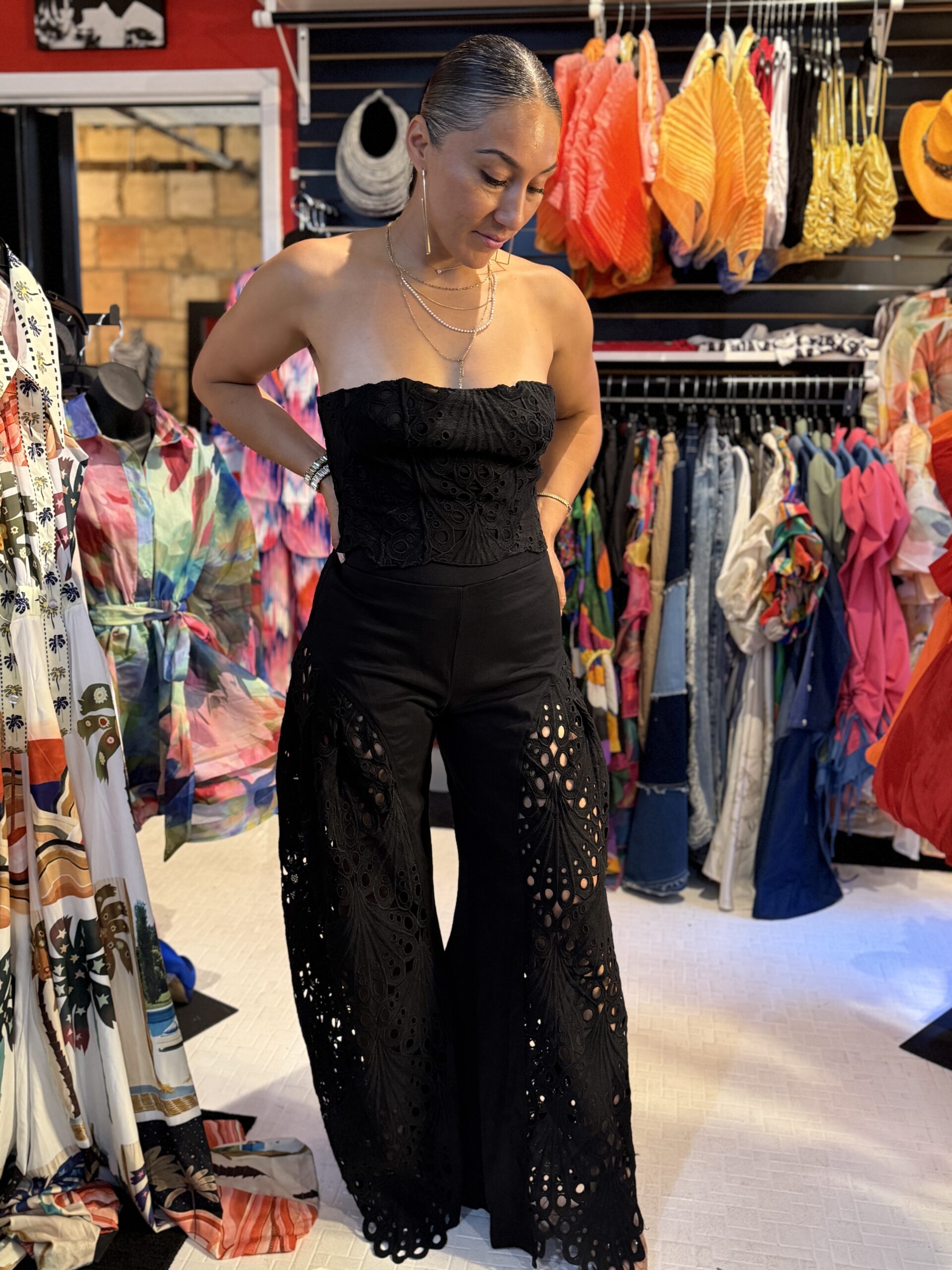 Stylish eyelit pants set that elevates any occasion. Also available in tan, white and beige