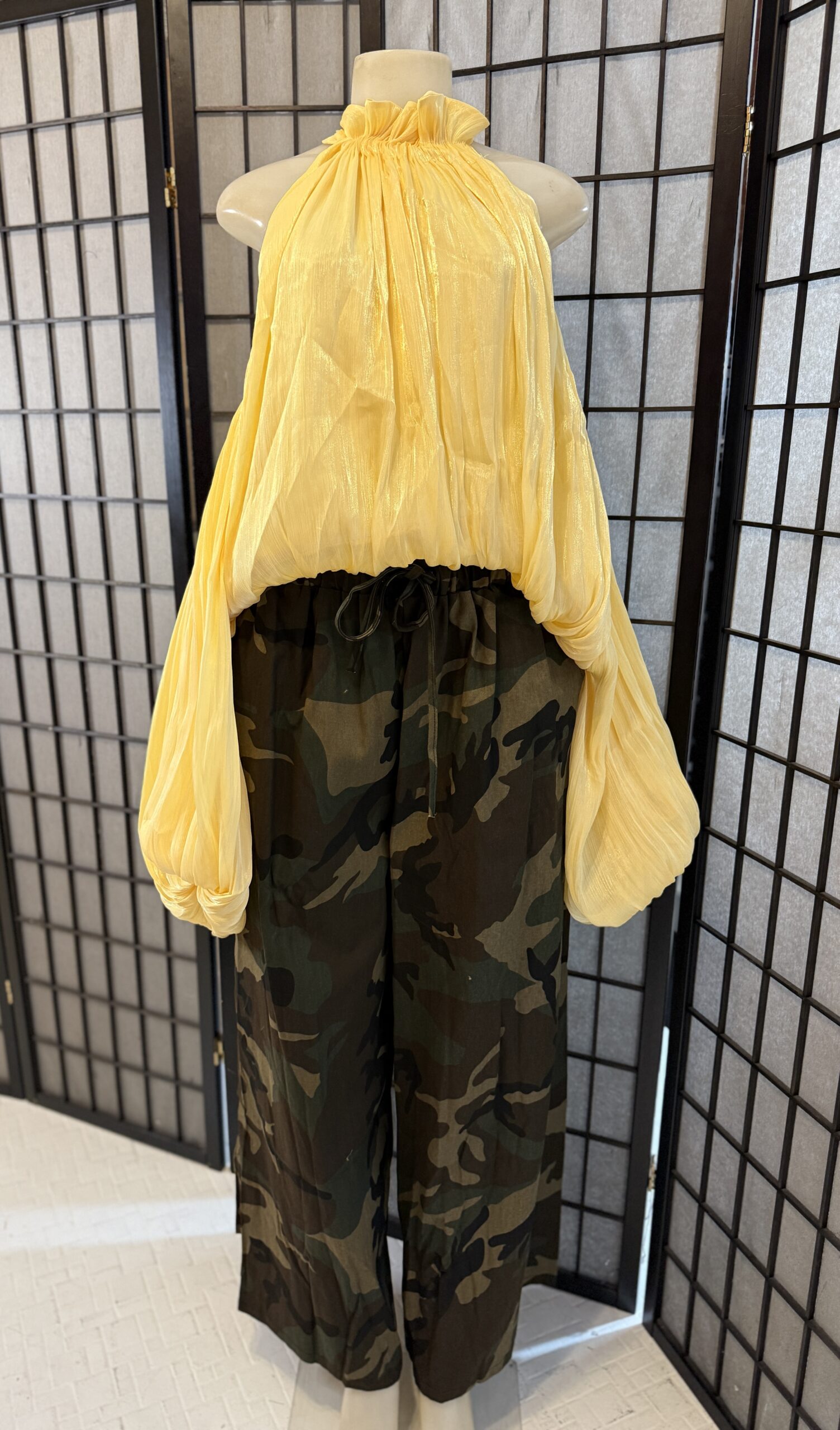 Make a statement in this stunning blouse featuring cold shoulders and belled sleeves. Also available in pink, black and white.
