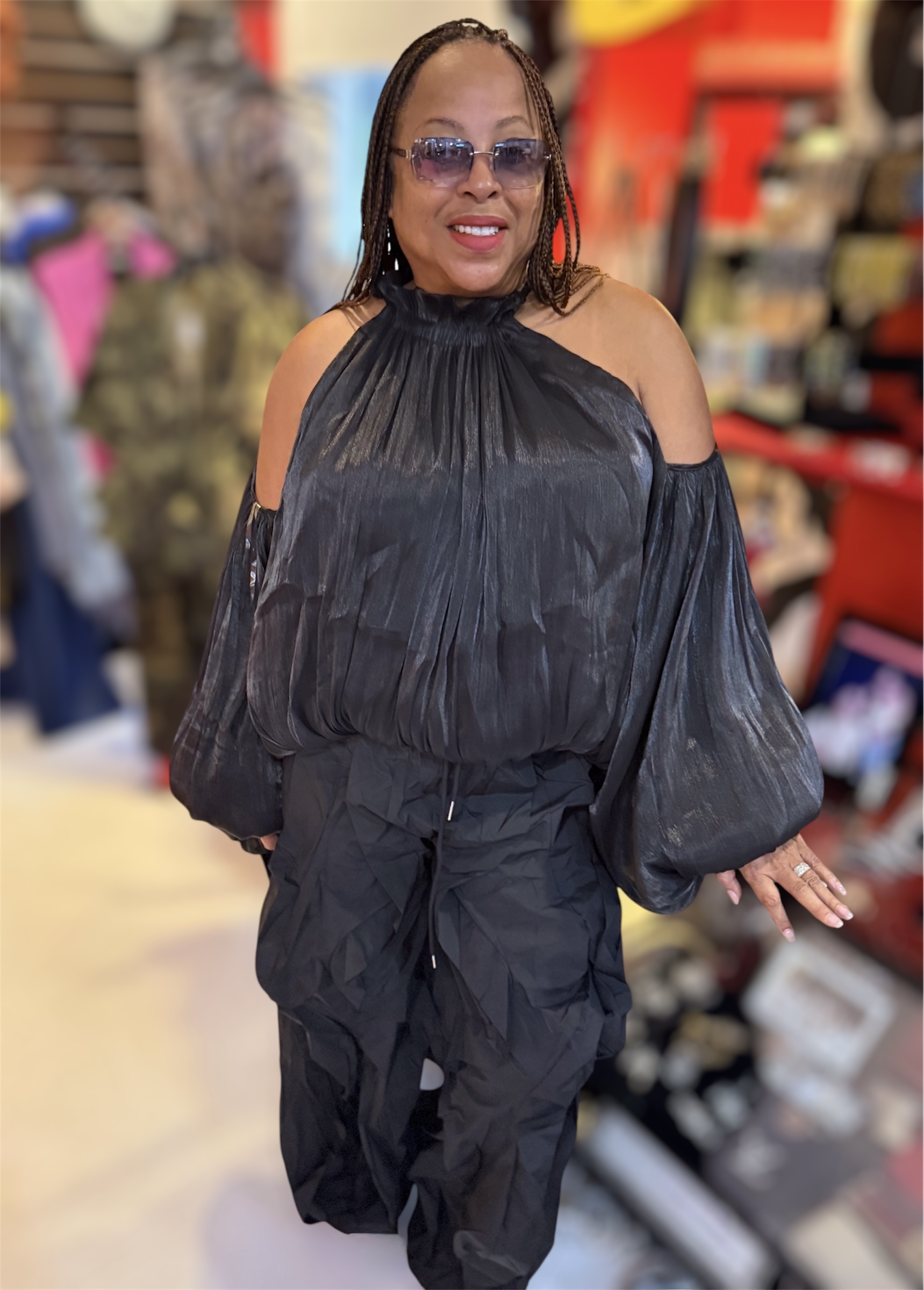 Make a statement in this stunning blouse featuring cold shoulders and belled sleeves. Also available in pink, black and white. Also available in 1X, 2X & 3X.