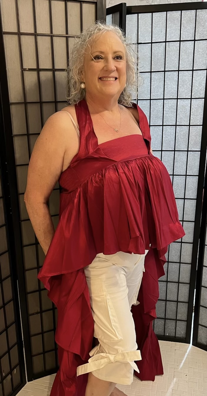 Cotton hilo cut blouse with elastic back in white, black and wine.