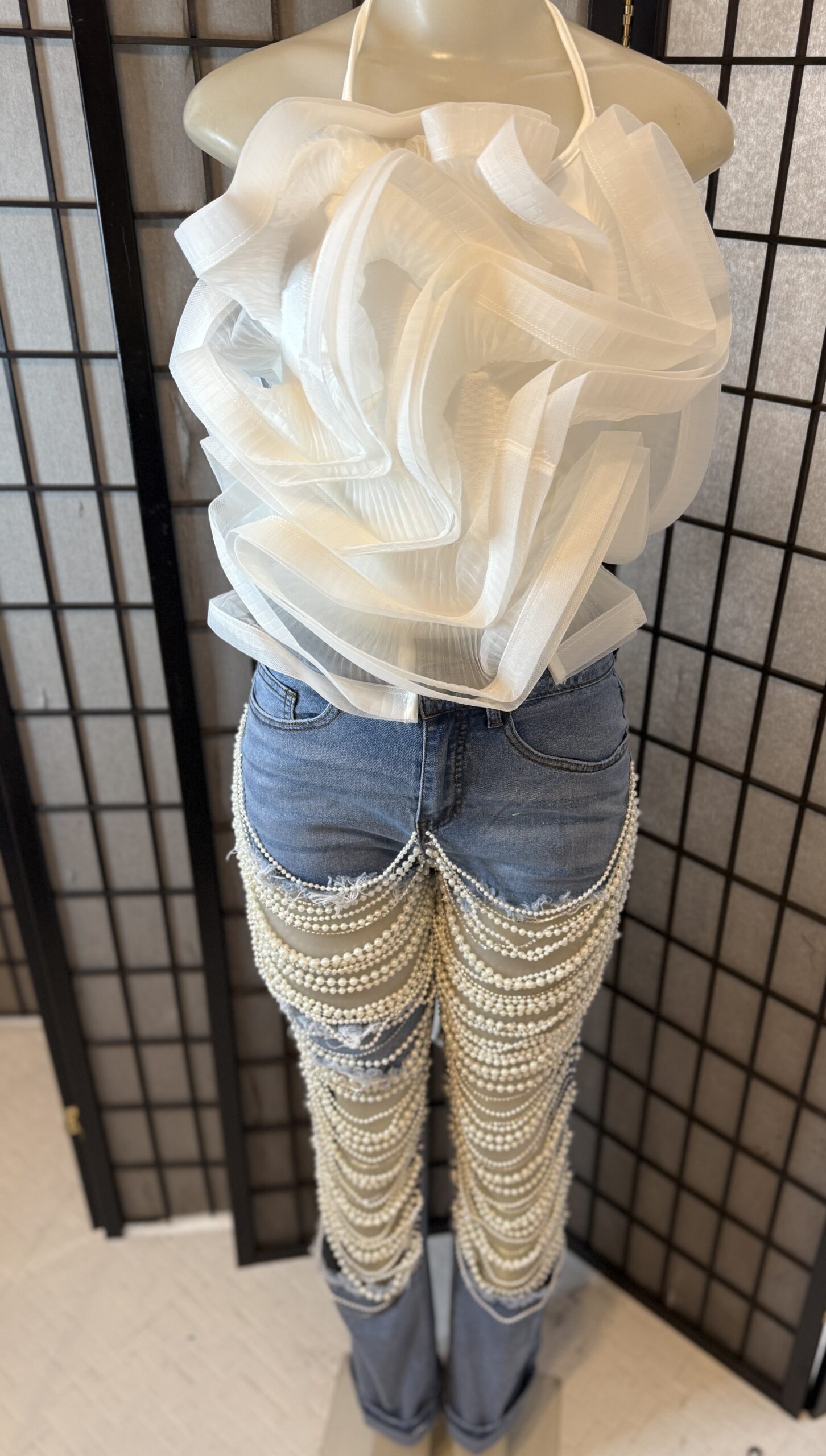 Make a bold entrance with this sculptural halter top, featuring dramatic organza ruffles that swirl with high-fashion flair. Also available in Black.